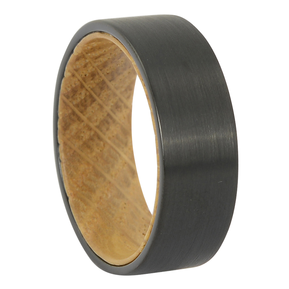 This tungsten carbide men’s ring features a whiskey barrel wood inlay. Scratch-resistant, weighty, and built for sharp everyday wear.