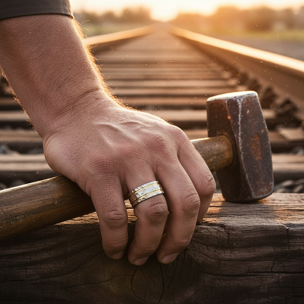 Bold & Unique Titanium Band with Hammered Finish and Twin Gold Plated Grooves